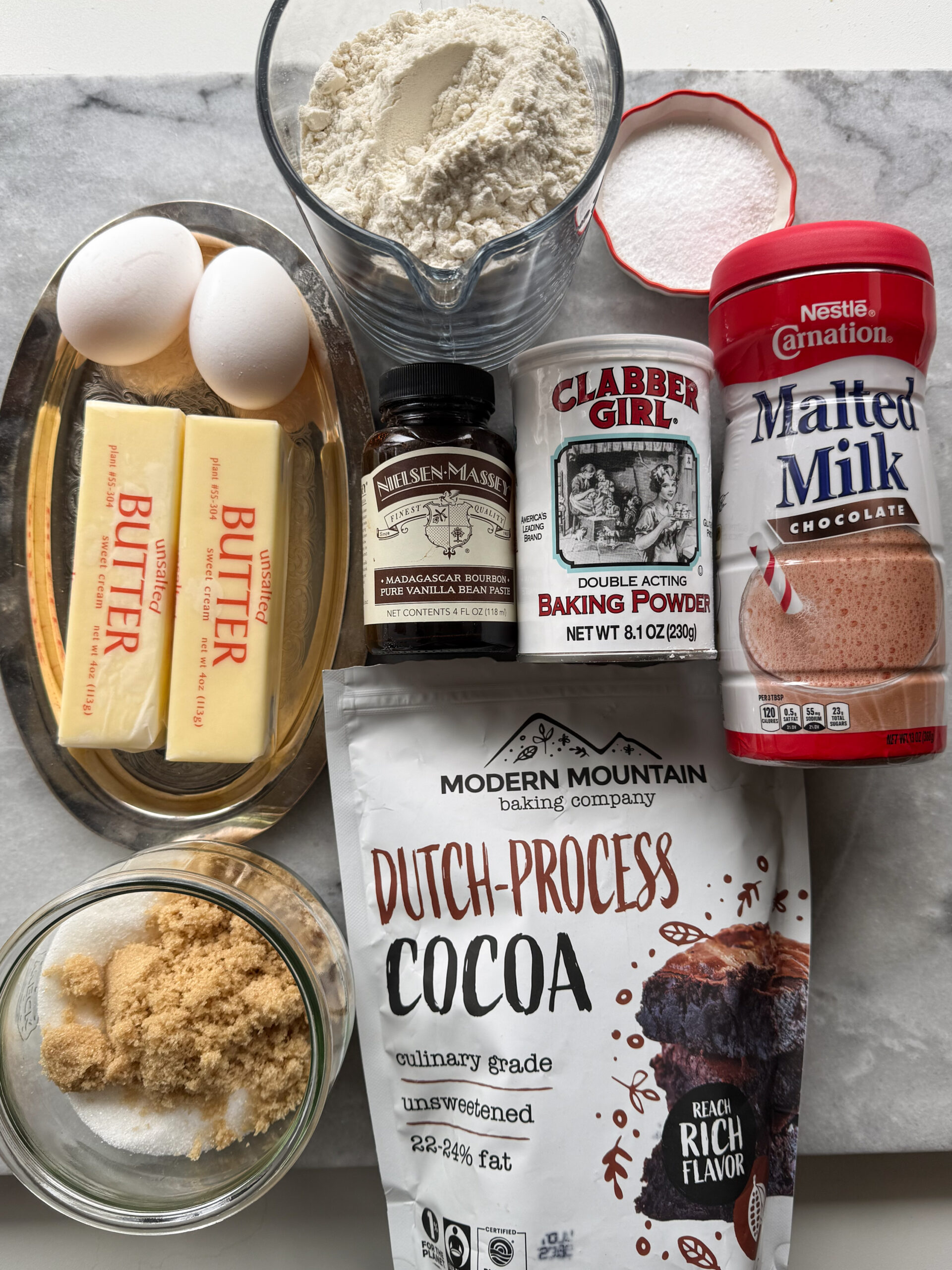 - cocoa powder– Dutch process for the chocolate flavor (It will replace some of the flour.) I like Modern Mountain Dutch process cocoa.