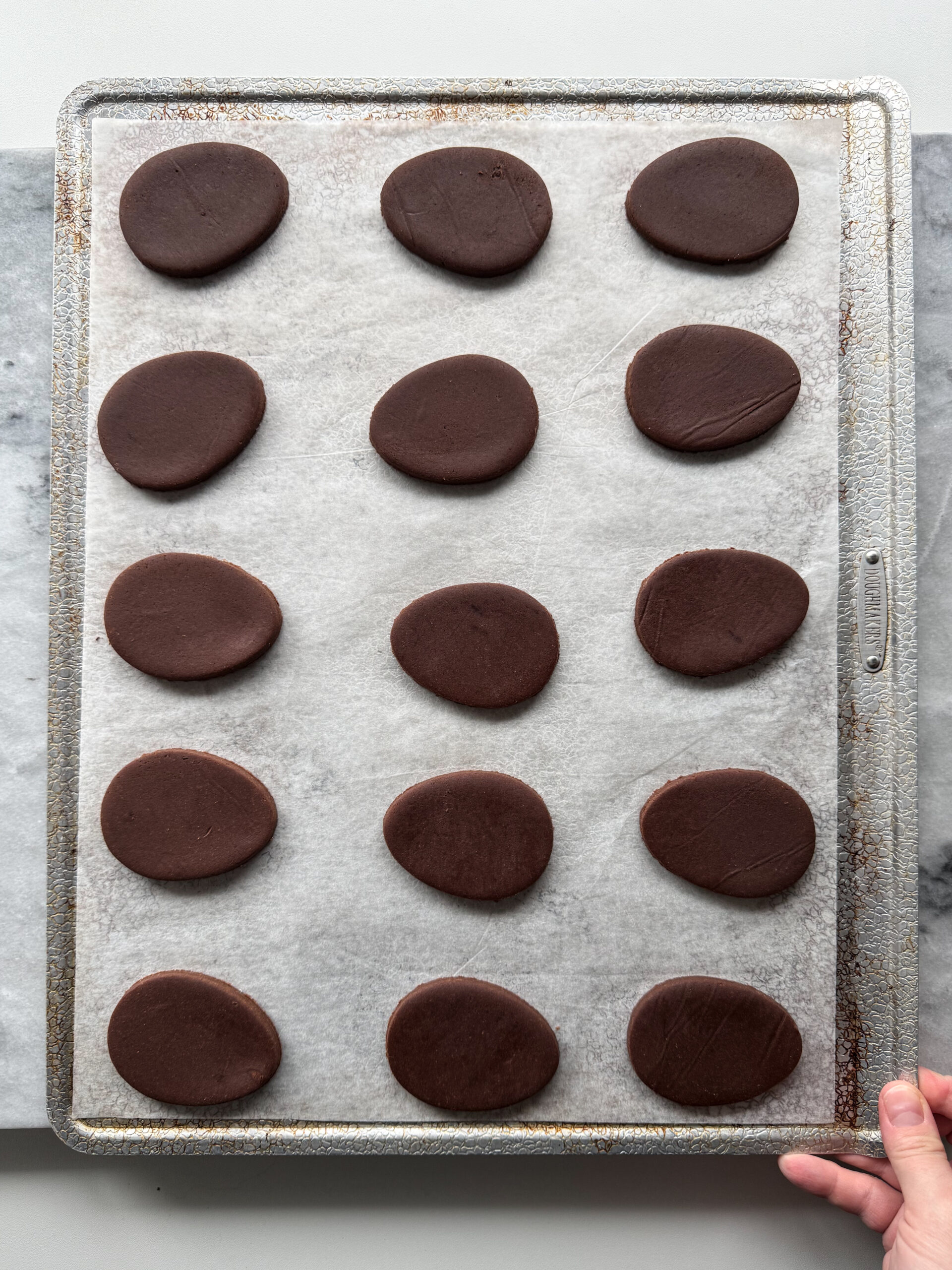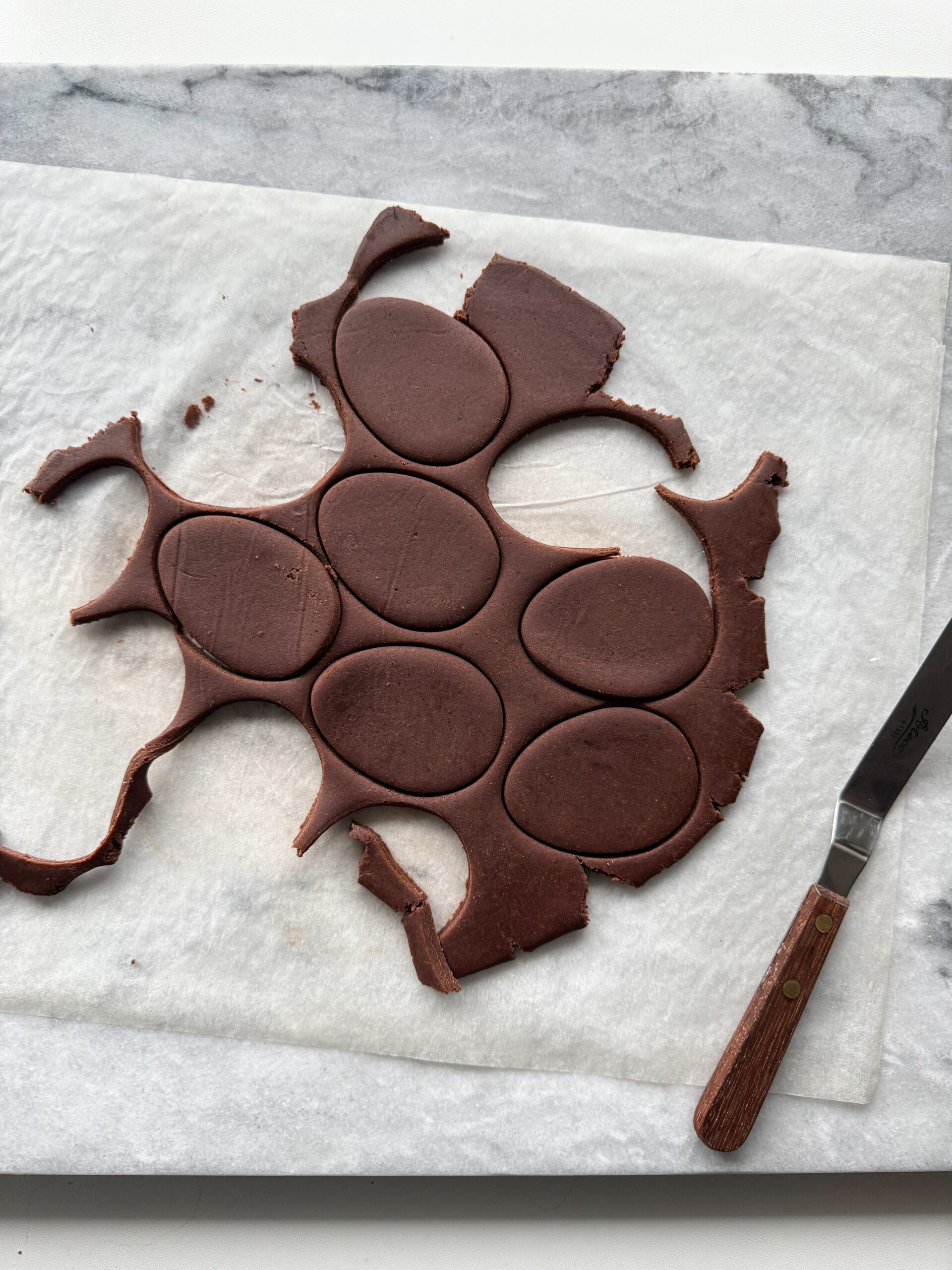 Roll the dough between parchment to your desired thickness, I like ¼″, before chilling for about two hours (or up to five days if it’s sealed sufficiently).