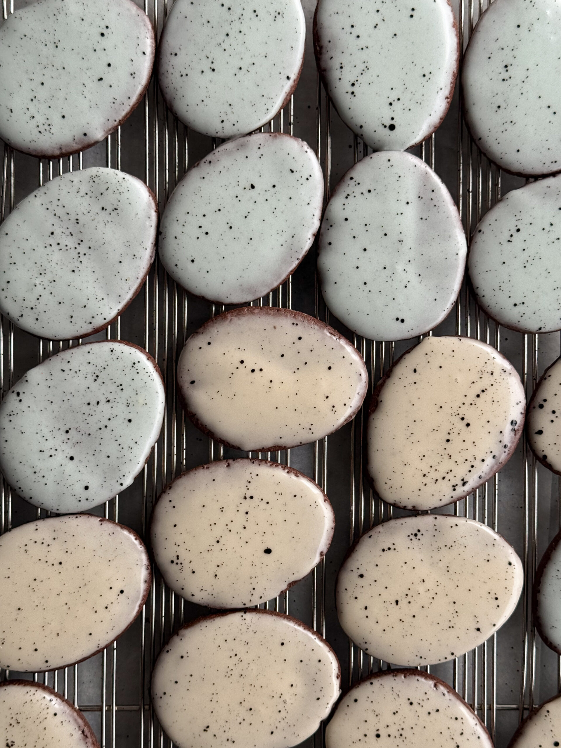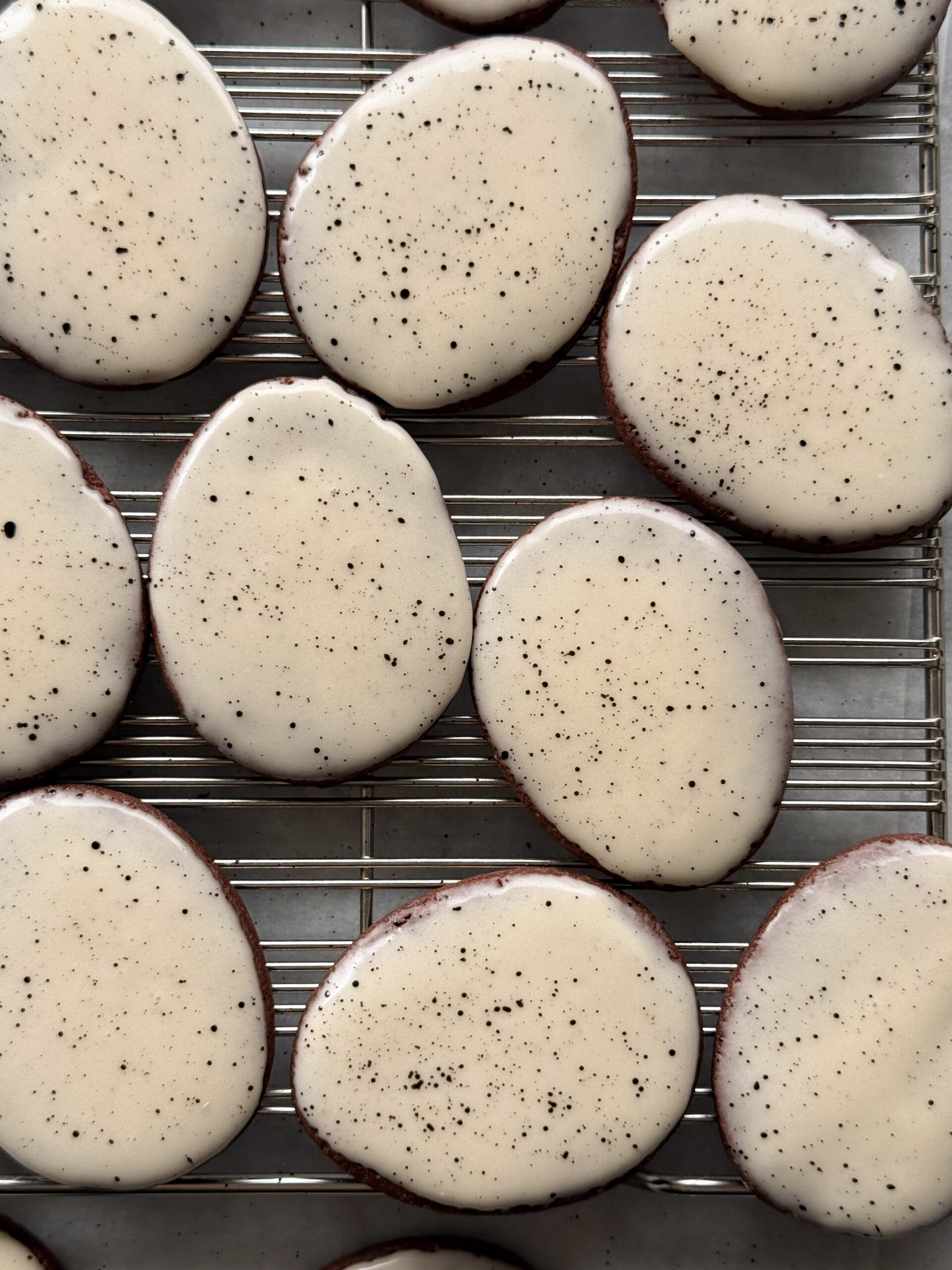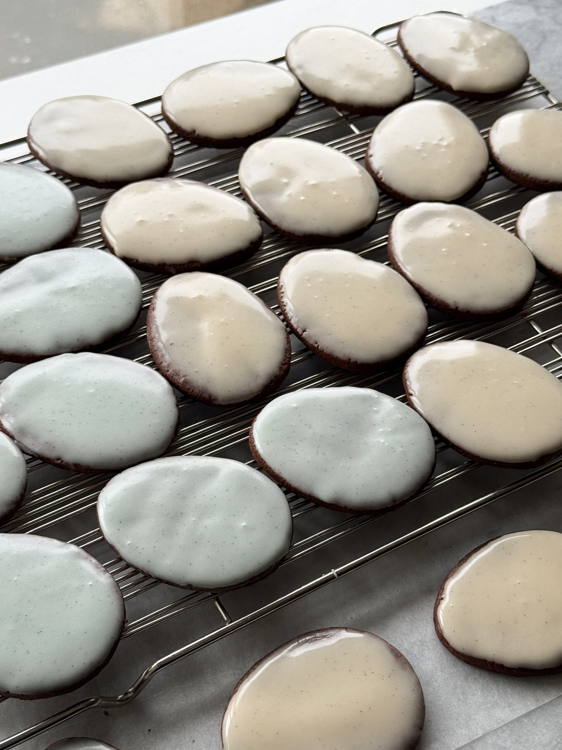 Dip each cookie by holding it securely upside down and gently pressing it into the surface of the icing, allowing the entirety of the cookie to come into contact with the icing. Allow the excess to drip off back into the bowl. Place the cookie down on a wire rack or piece of parchment paper, giving the icing time to set. (About twenty minutes should do the trick.)