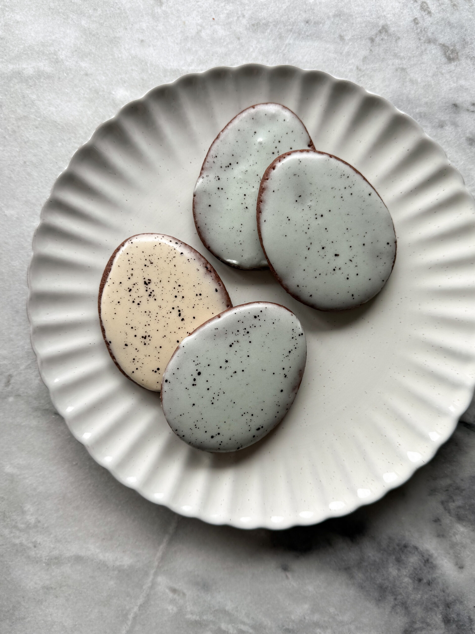 Squeeze a bit of black or brown food coloring into a little bowl and add some water until it is slightly more liquidy. Use a paintbrush to splatter drops of food coloring onto the cookies so they resemble eggs.