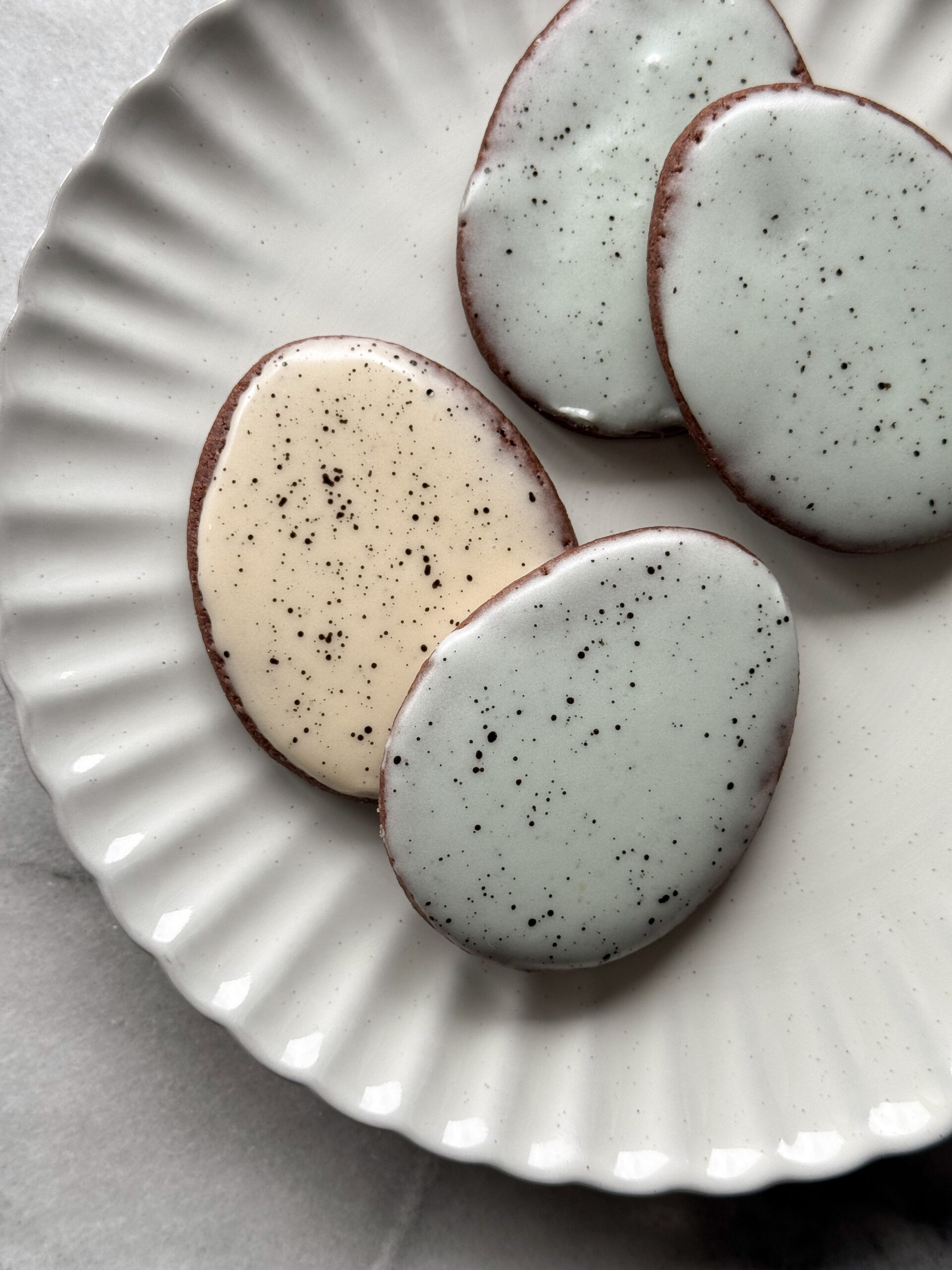 These chocolate sugar cookies are soft with a crisp edge and a rich chocolatey, malty flavor. You can decorate them with royal icing or with this delicious malty powdered sugar glaze that is perfect for quick and easy decorating by dipping. A splattering of food coloring makes these cookies perfect for spring.