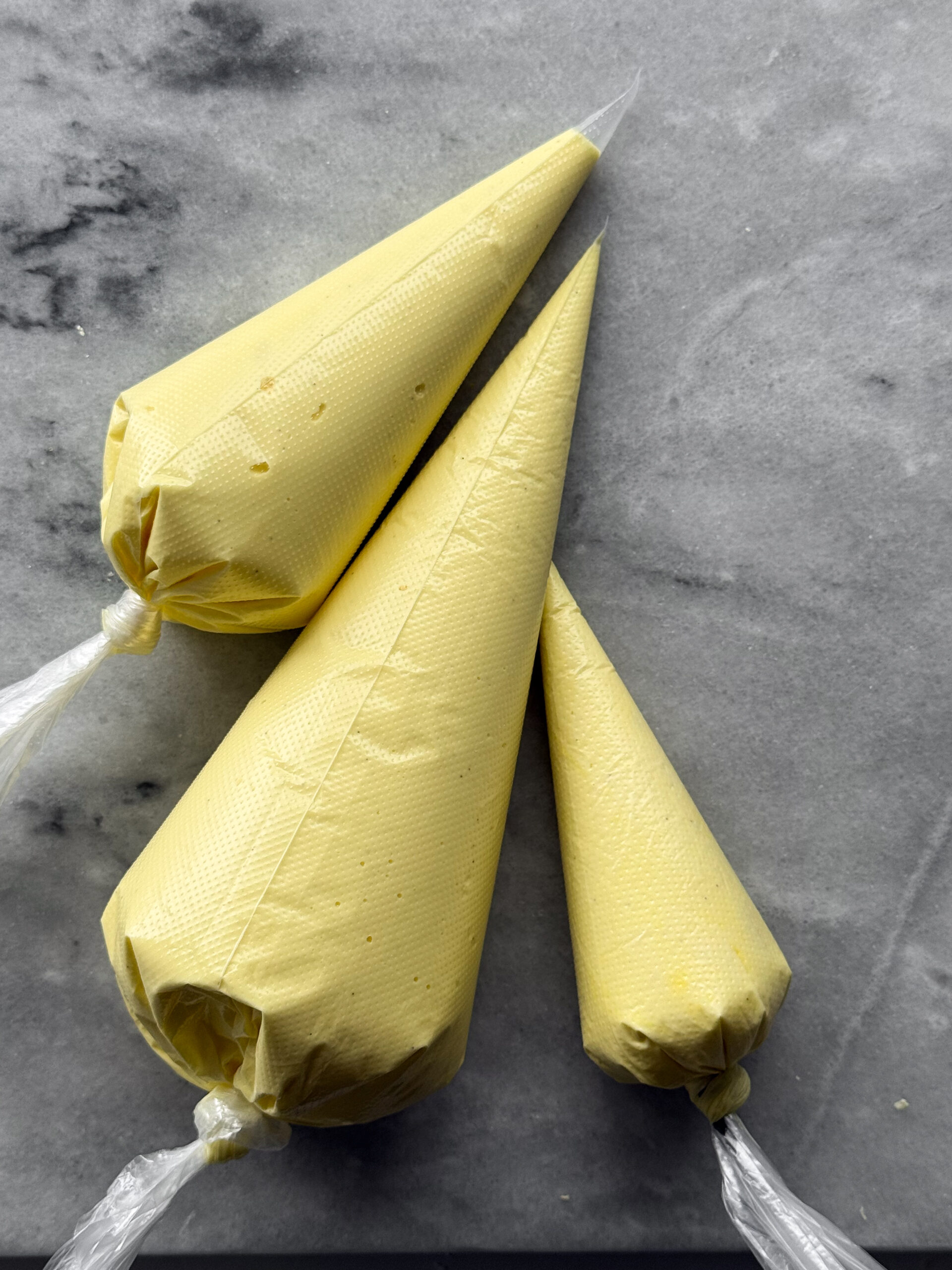 While the cookies are cooling, make the lemon royal icing. To the bowl of a stand mixer, add the meringue powder, salt, and ⅓ cup liquid (about half each lemon juice and water). Whisk until frothy and until there are no lumps. Add the powdered sugar and mix on a low speed until the mixture is smooth and combined. Add the vanilla, corn syrup, and food coloring and mix for 3 minutes on a medium speed (speed 4 on the stand mixer). If the icing is extremely thick, add a bit of water or lemon juice. The icing should be a thicker consistency that is similar to toothpaste and glossy. Bag a small amount of this for the outline. Add additional lemon juice (or water if you don’t want it too lemony- taste test!) and mix until the icing is a flood consistency. It should be similar to honey- thickly drippy. Bag this icing and set aside.