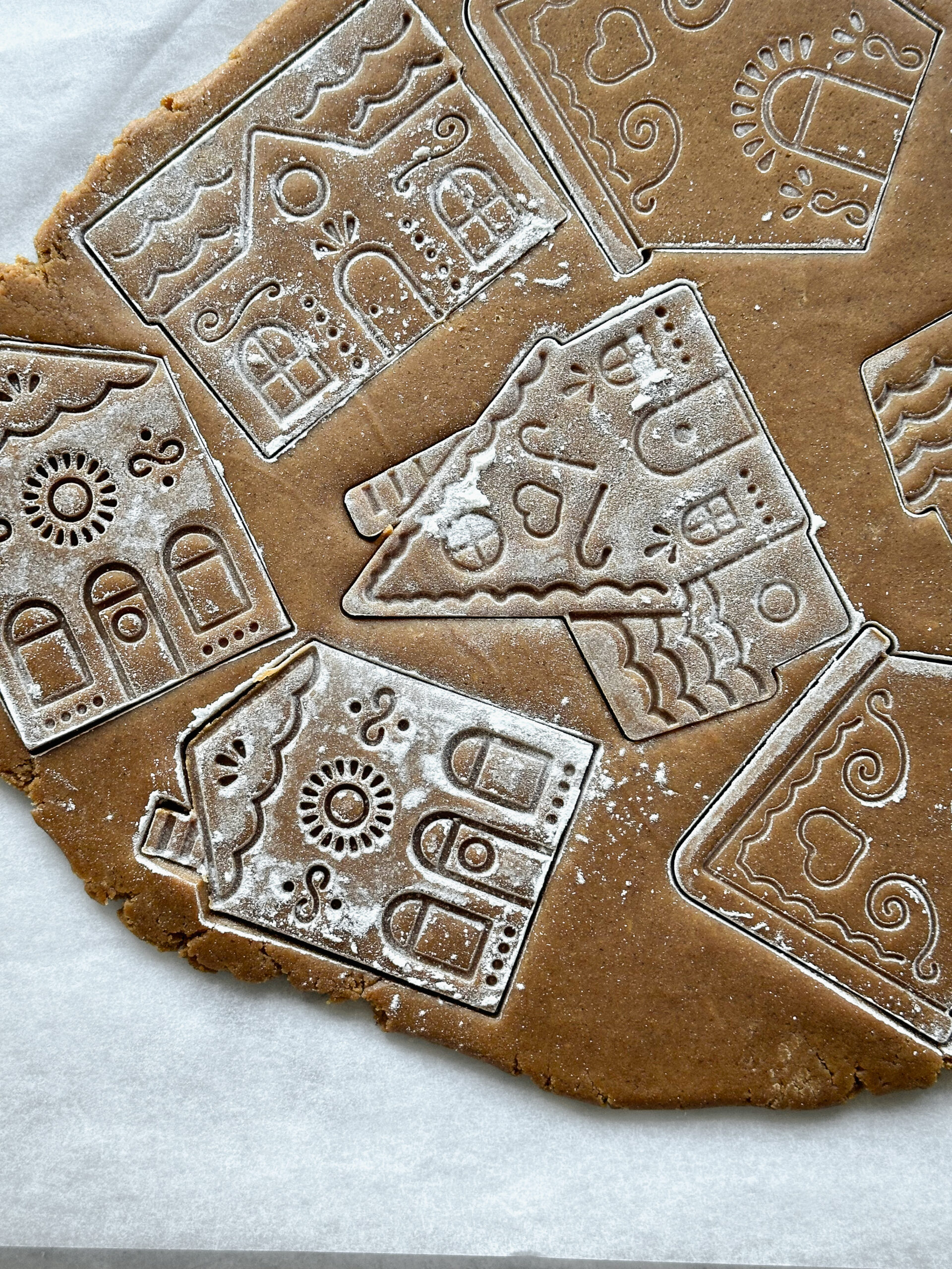 The dough for these cookies can be prepared two ways: rolling and cutting like cut out cookies or scooping balls and stamping. Both ways work really well, and it just depends on what process you’re in the mood to do. Scooping balls is a tiny bit easier, though. Keep in mind your cutter shape. If you’re doing round stamps, then you can do either method. If your cutters are shaped like the ones in the image below (gingerbread men, houses, trees, etc.), then you’ll have to do the roll out method.