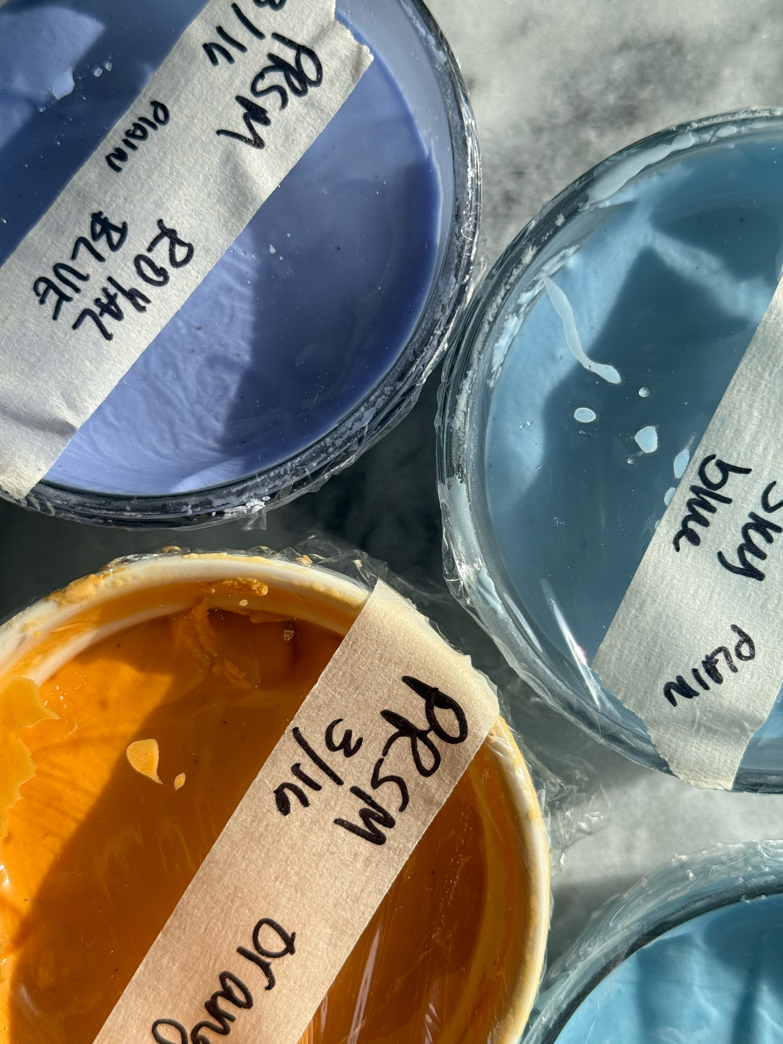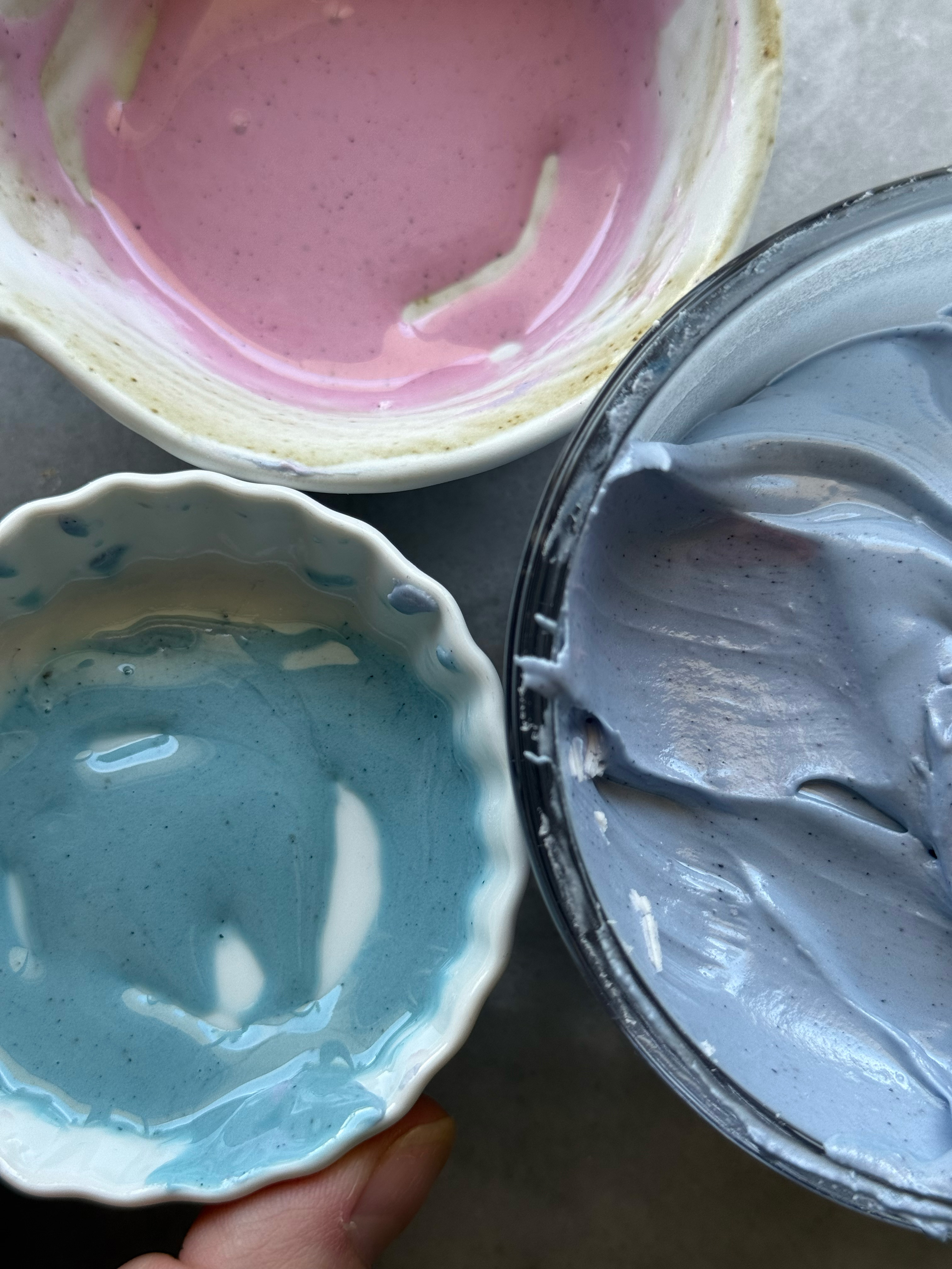 blue with ph changes- the pink (top left) has added lemon juice and the blue (bottom left has added baking soda, and the periwinkle shade (right) is the blue as is