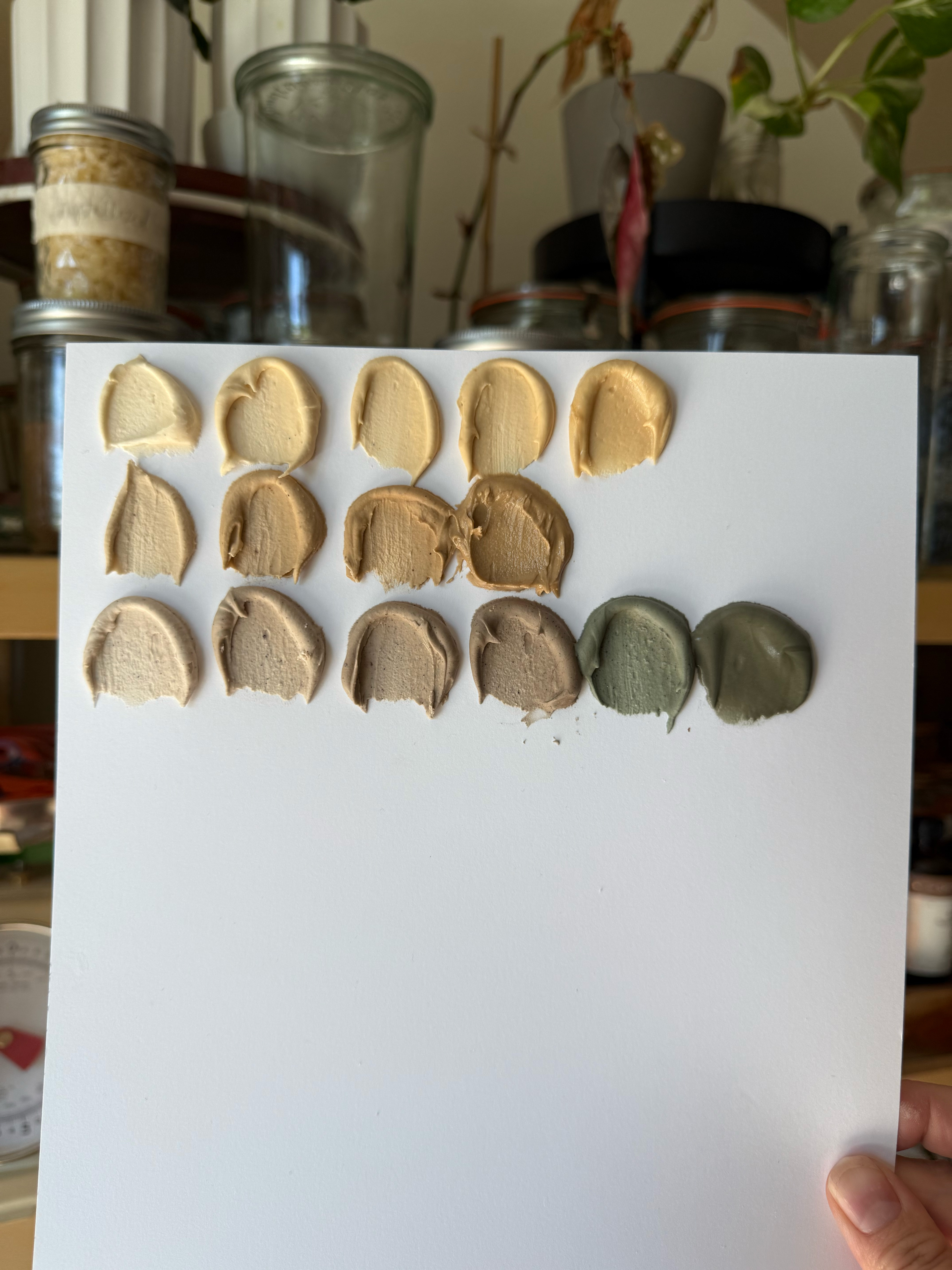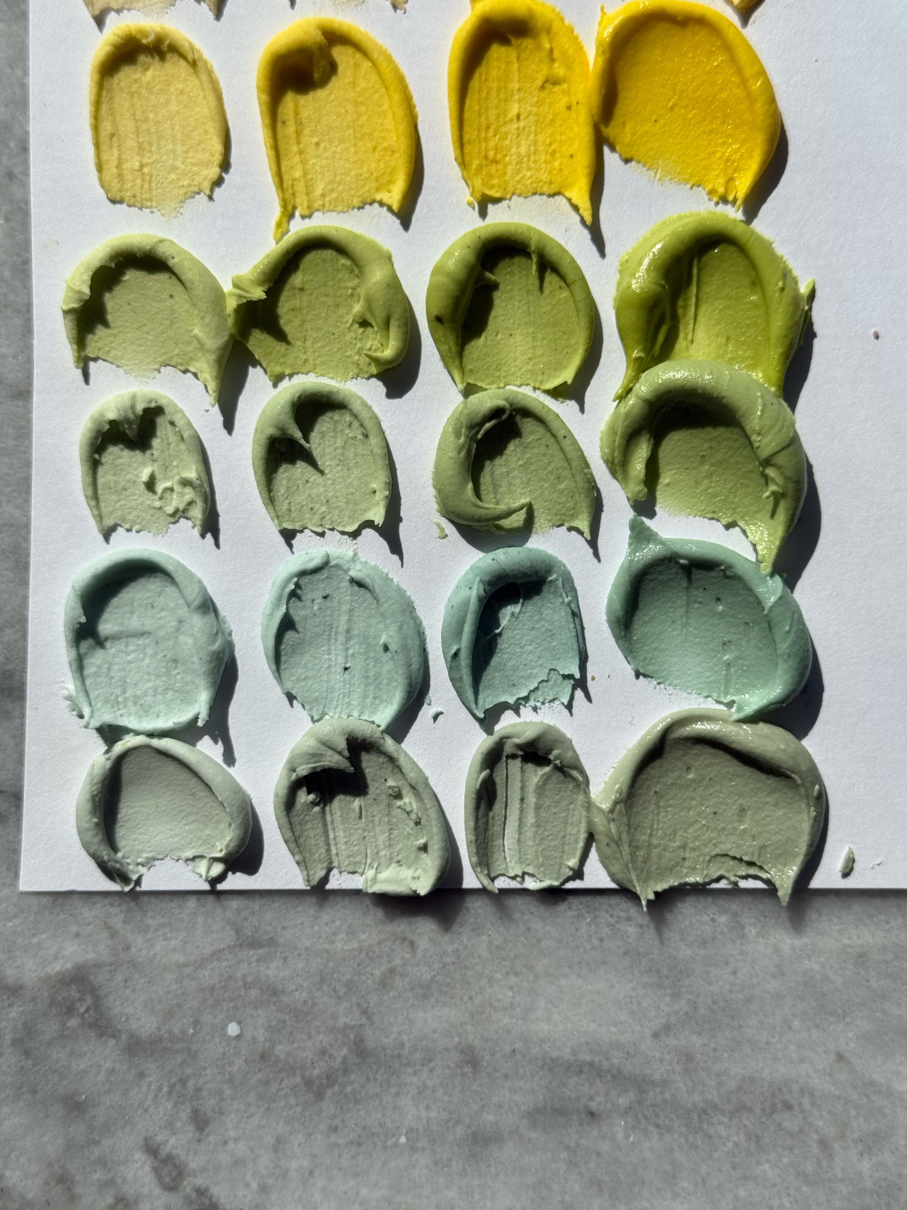 see the difference between the greens in these swatches- swatched at light, medium, dark, and after developing 24 hrs